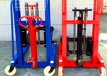 手動液壓堆垛車屬于一款特殊液壓升降機,由液壓系統(tǒng)、門架和貨叉三部分組成。