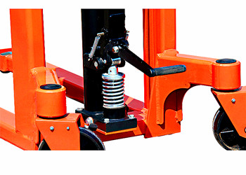 門架采用優(yōu)質(zhì)型鋼焊接而成,剛性好、強度高。后輪使用帶剎車裝置的萬向輪,可自由旋轉、轉動輕便靈活,前后輪均以滾珠軸承安裝于輪軸上,轉動靈活。車輪為尼龍輪,耐磨、耐用,且不易損壞工作地面。手動液壓堆垛車